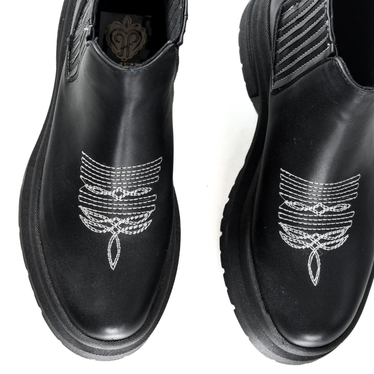 Este botín negro de plataforma es la combinación perfecta entre actitud, comodidad y resistencia. Su diseño urbano con detalle bordado al frente le da un toque distintivo, ideal para quienes buscan un calzado versátil pero con personalidad.