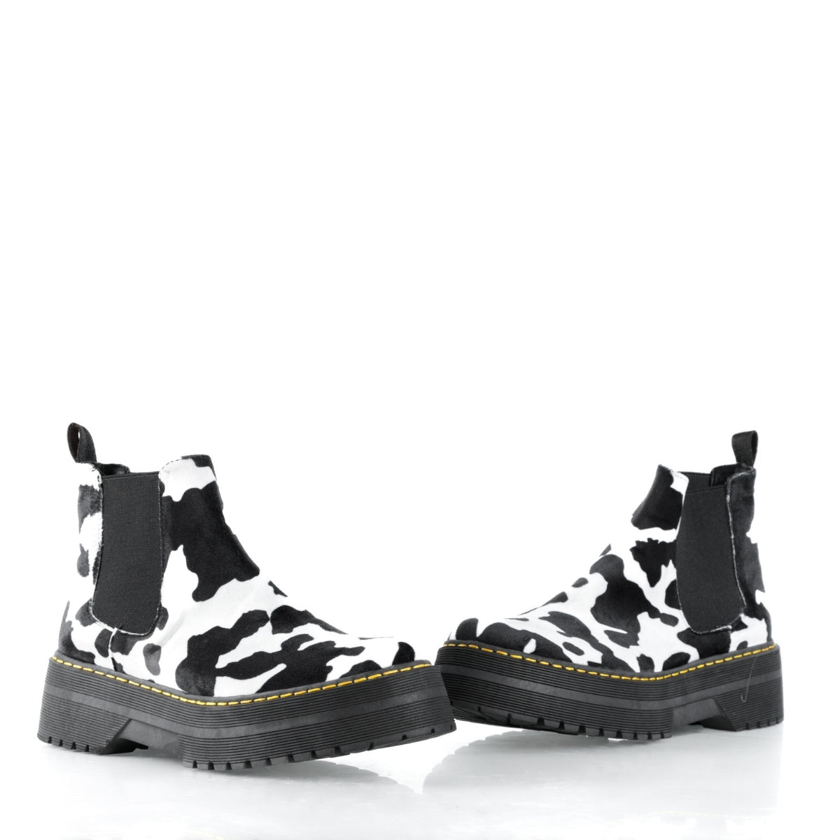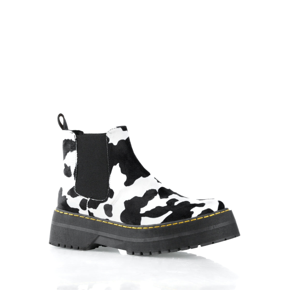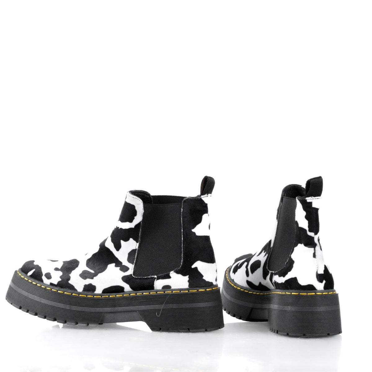 Este modelo destaca por su diseño atrevido y original, con estampado tipo cow print que lo convierte en una pieza protagonista para looks alternativos, urbanos y fuera de lo común. Su silueta tipo botín con elástico lateral permite un ajuste cómodo y práctico para el uso diario.