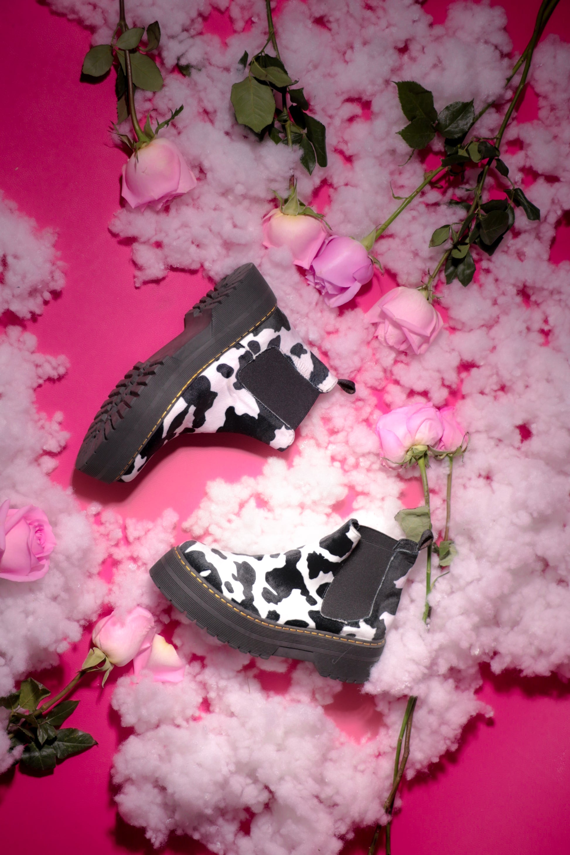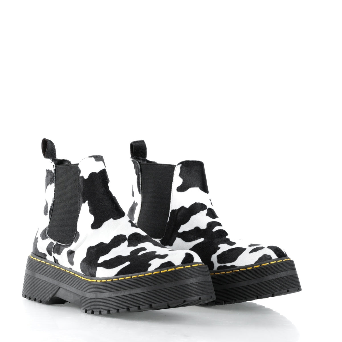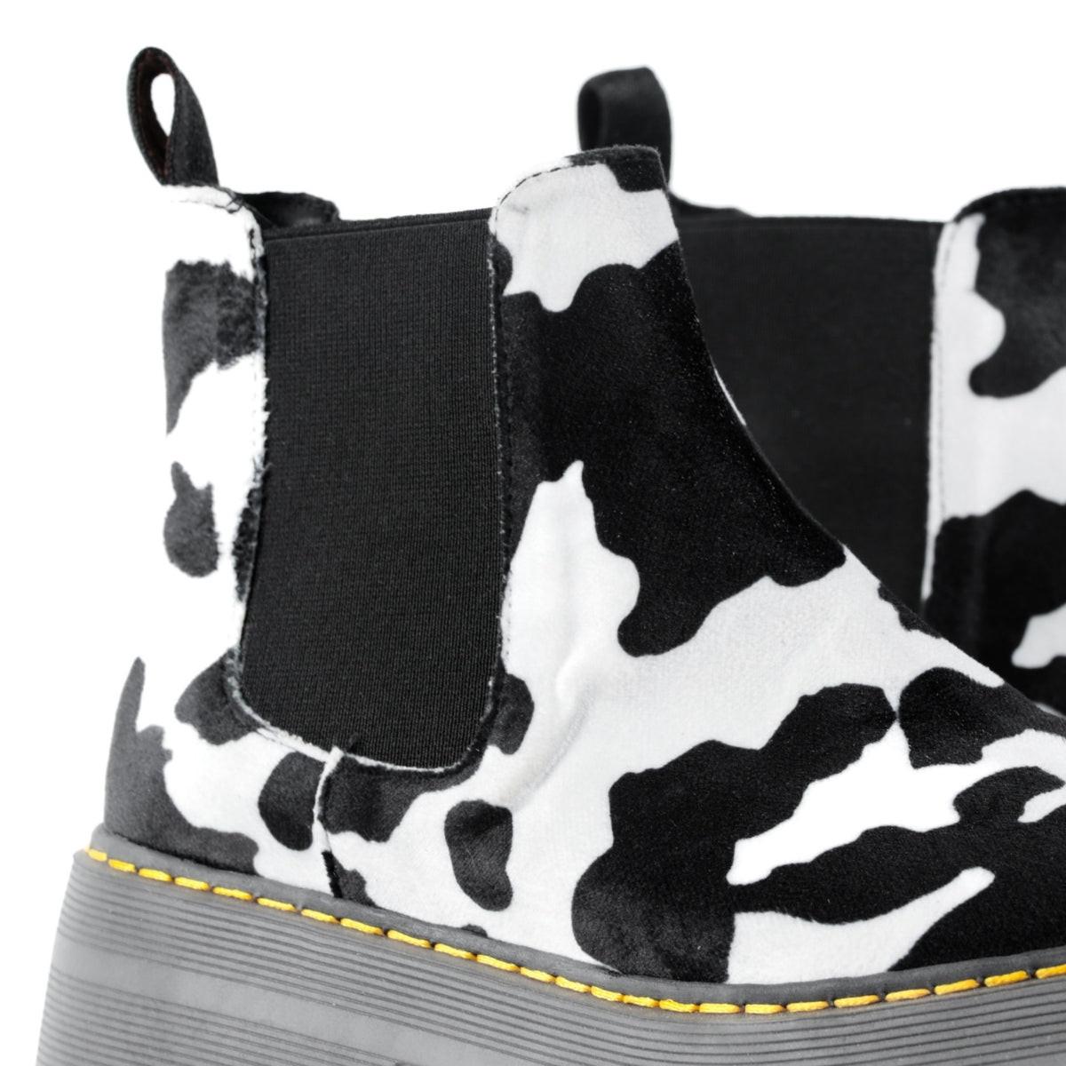 Este modelo destaca por su diseño atrevido y original, con estampado tipo cow print que lo convierte en una pieza protagonista para looks alternativos, urbanos y fuera de lo común. Su silueta tipo botín con elástico lateral permite un ajuste cómodo y práctico para el uso diario.