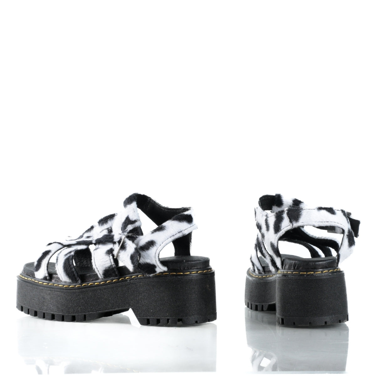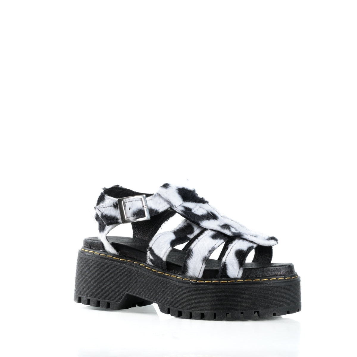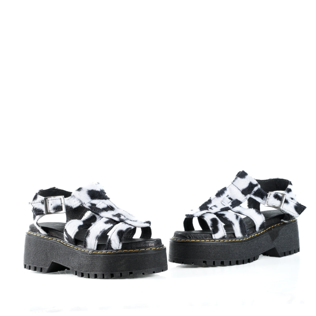 Este modelo destaca por su diseño audaz y fuera de lo común, con acabado tipo cow print que lo convierte en una pieza protagonista para looks alternativos y urbanos. Su silueta tipo sandalia con plataforma y tiras brinda un ajuste firme y cómodo, ideal para el uso diario.