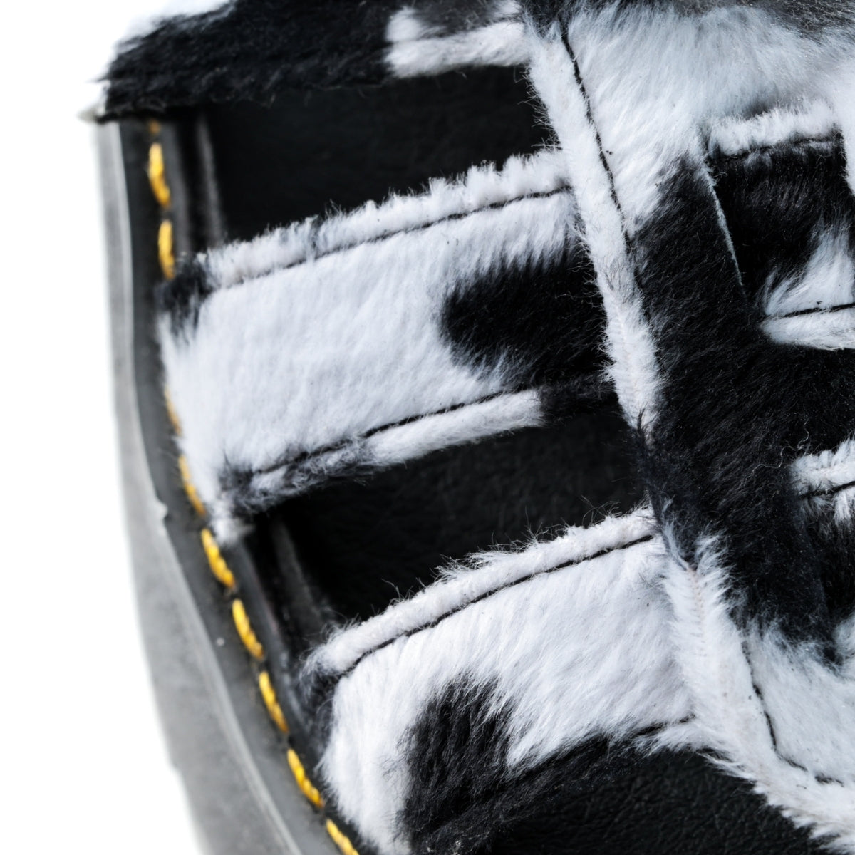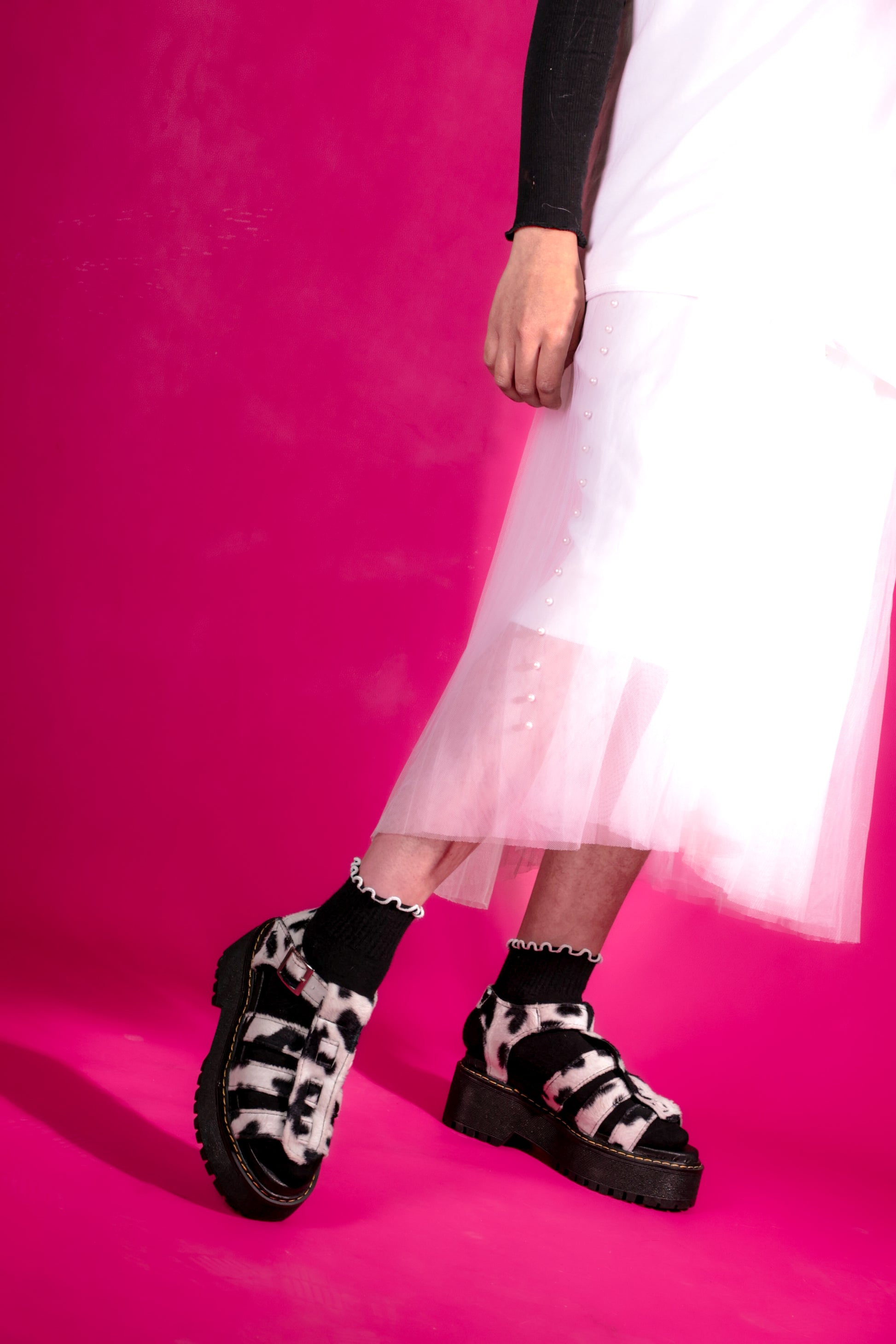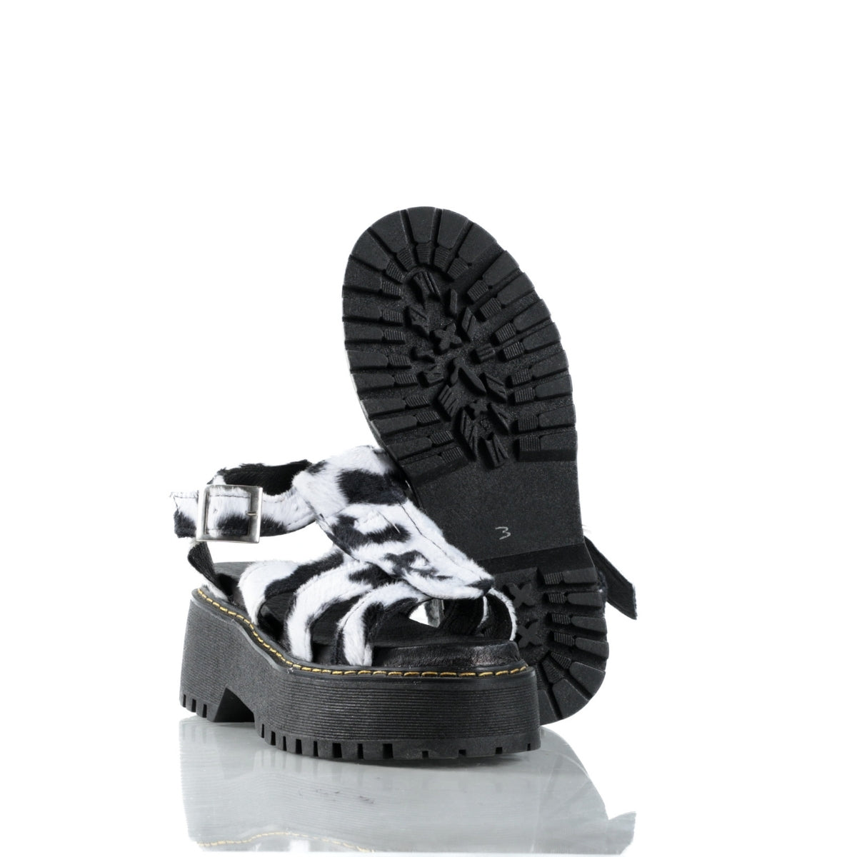 Este modelo destaca por su diseño audaz y fuera de lo común, con acabado tipo cow print que lo convierte en una pieza protagonista para looks alternativos y urbanos. Su silueta tipo sandalia con plataforma y tiras brinda un ajuste firme y cómodo, ideal para el uso diario.