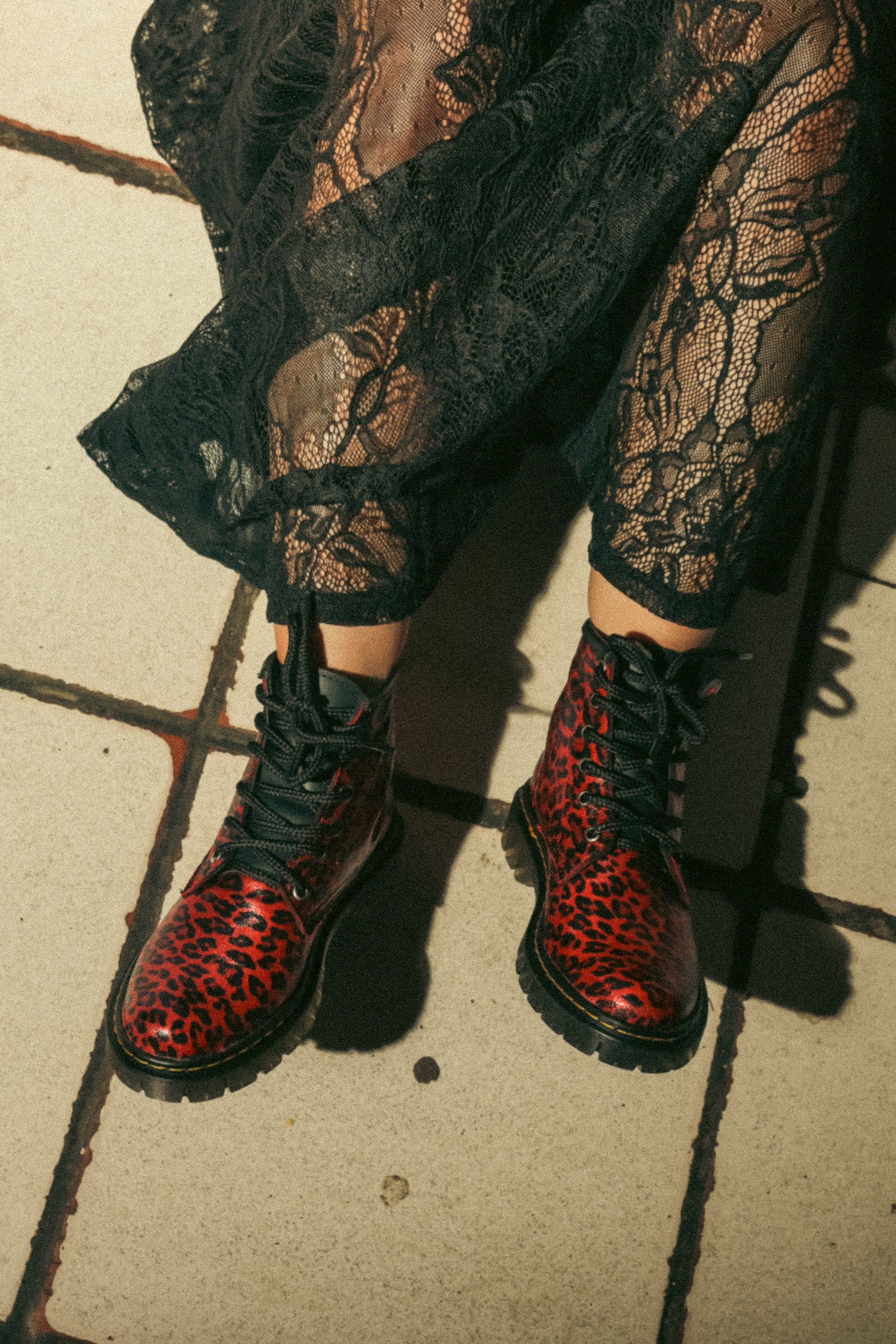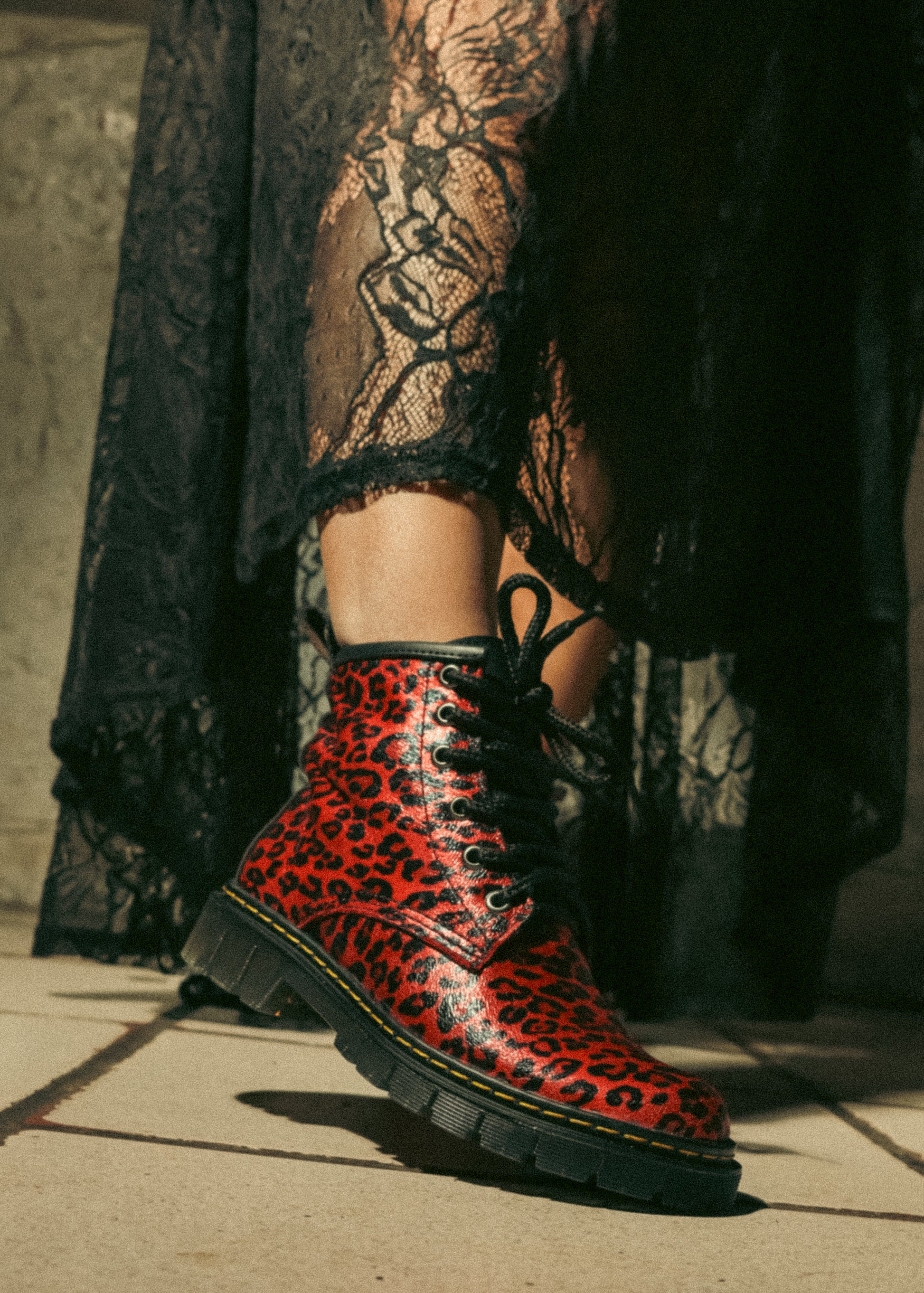 Confeccionada en piel con acabado animal print rojo, su diseño desafiante combina la fuerza de una suela chunky con el detalle urbano de agujetas negras.