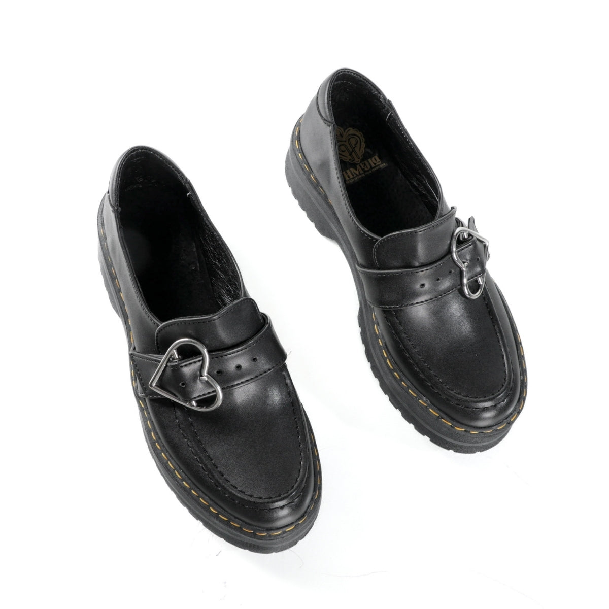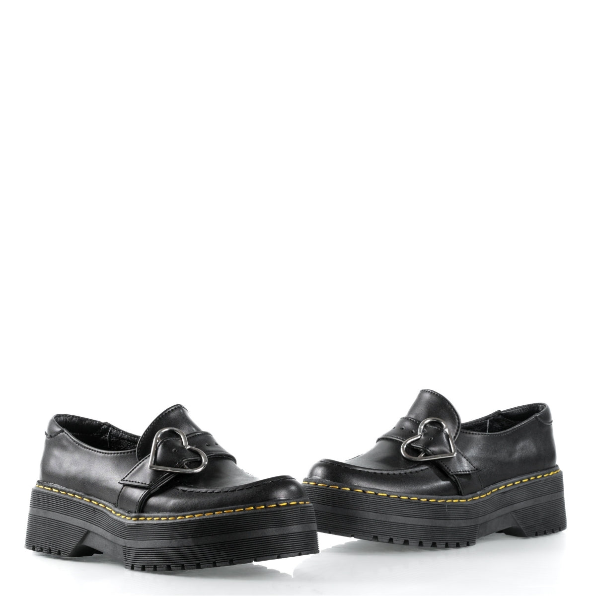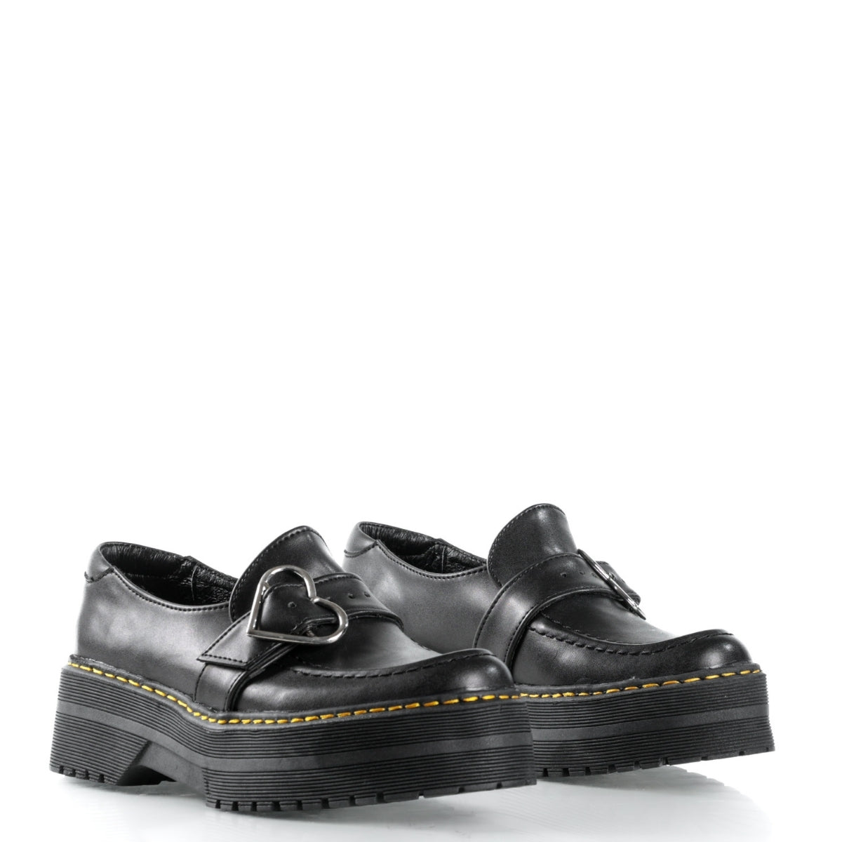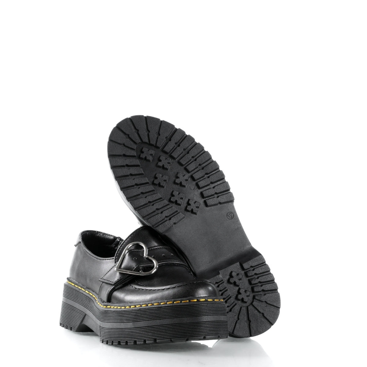Este modelo combina un diseño clásico tipo Mary Jane con una estética alternativa y elegante. Su acabado en color negro y el detalle de hebilla en forma de corazón le dan un toque distintivo, ideal para quienes buscan un calzado cómodo con personalidad.